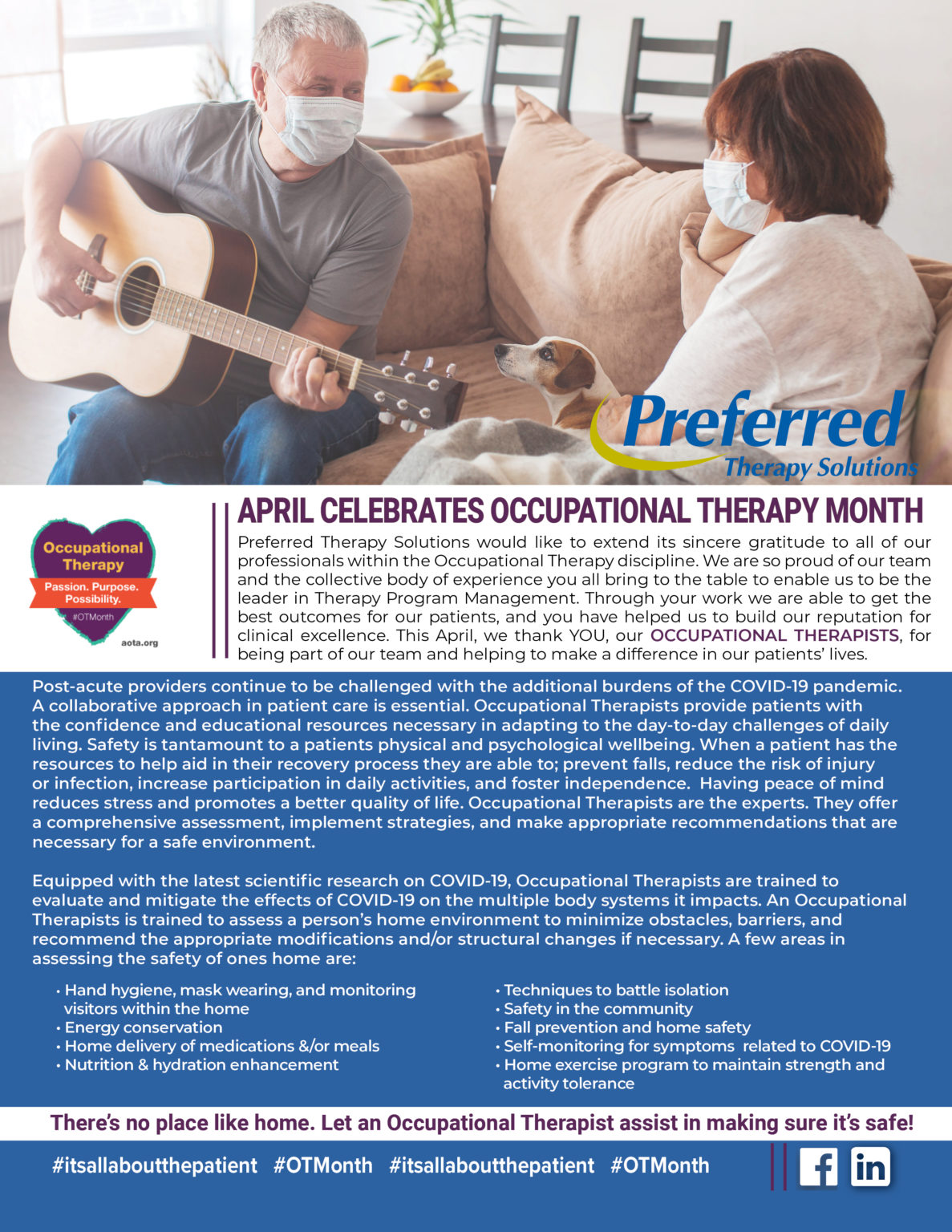 It’s Occupational Therapy Month. Preferred Therapy Solutions would like to extend its sincere gratitude to all of our professionals within the Occupational Therapy discipline. We are so proud of our team and the collective body of experience you all bring to the table to enable us to be the leader in Therapy Program Management. #OTmonth #occupationaltherapymonth #celebrateoccupationaltherapy #itsallaoutthepatient #PreferredTherapySolutions