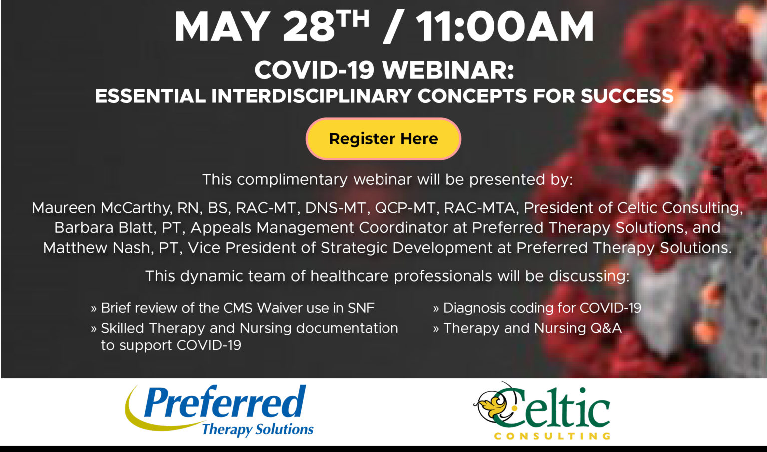 Preferred Therapy Solutions and Celtic Consulting will be hosting a series of collaborative webinars. The next webinar will be on May 28, 2020. Register at: https://bit.ly/2zaqqef
